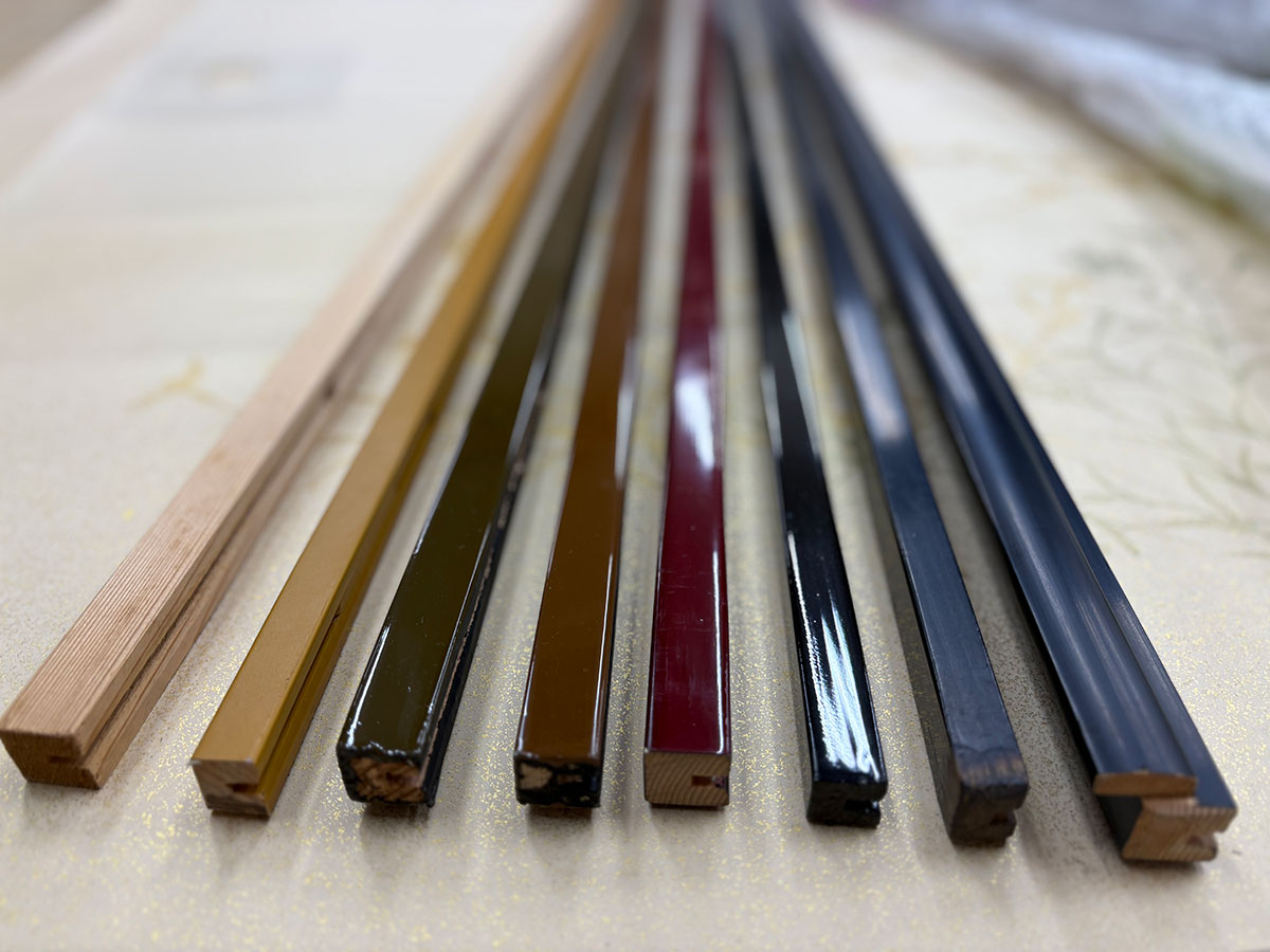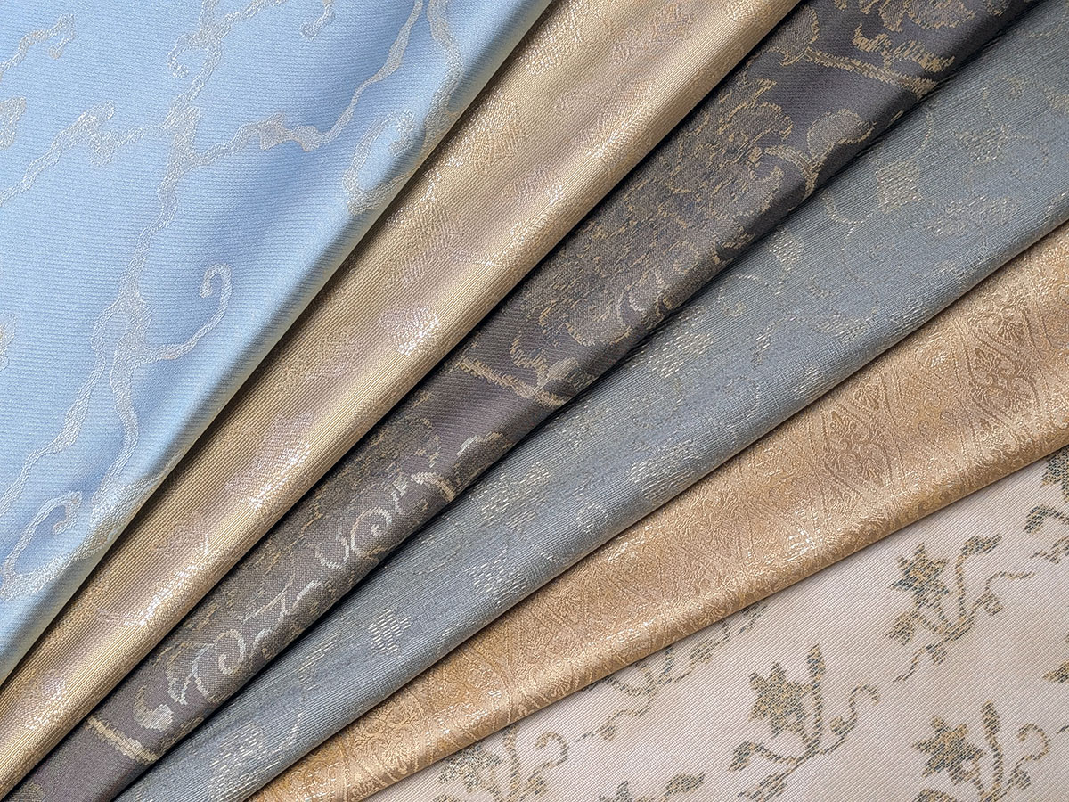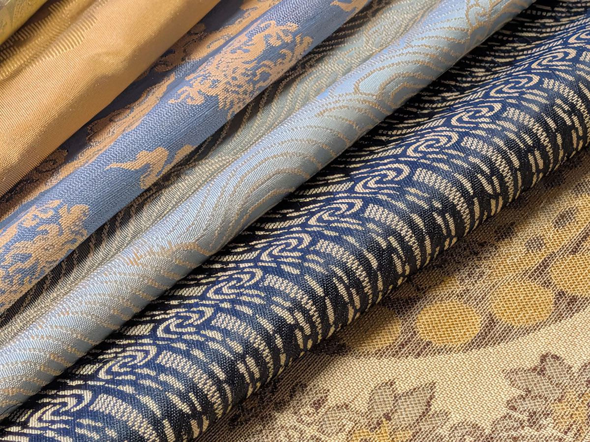 金糸・金箔糸を緯(よこ)糸に用いて文様を織り出した、高度な織技術による裂地です。華麗な光沢と重厚な存在感があり、格式の高い掛軸・屏風などに古来より用いられてきました。文様や織りの密度によって格調が変わり、作品の格を上げる「表具の要」とされる素材です。