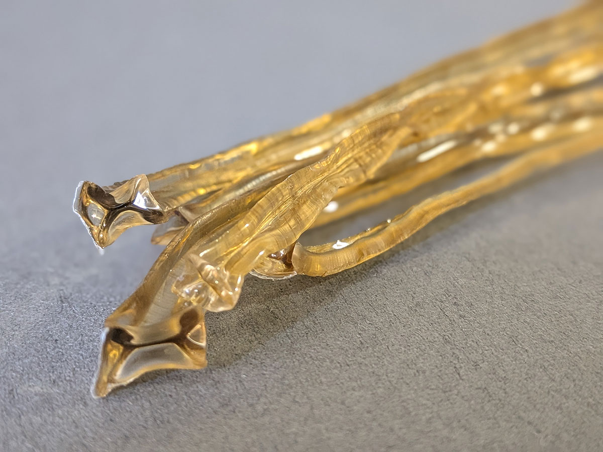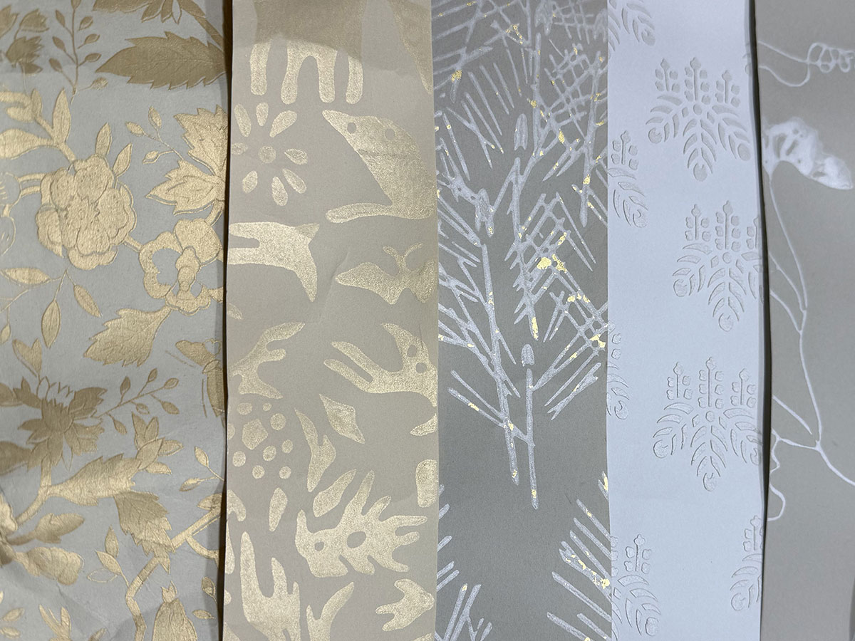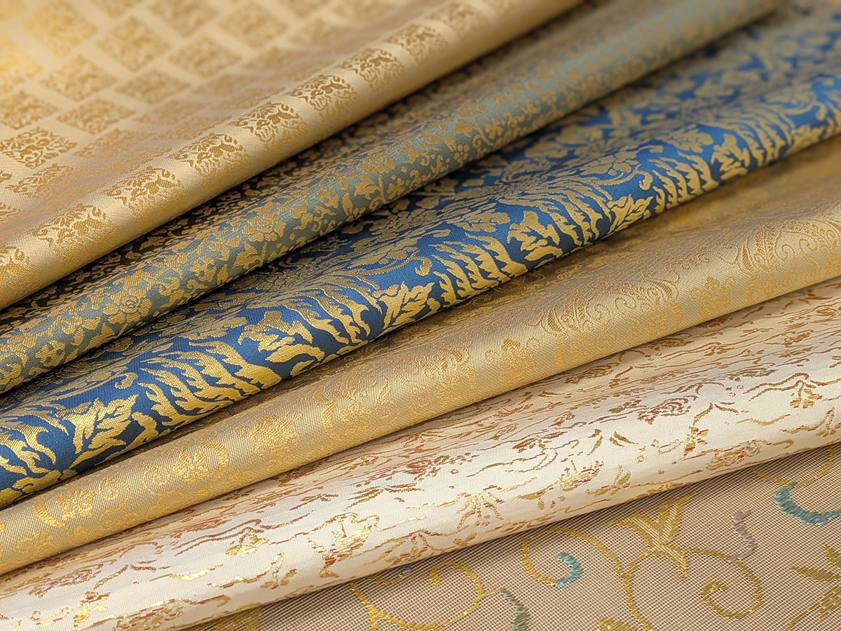 金糸・金箔糸を緯(よこ)糸に用いて文様を織り出した、高度な織技術による裂地です。華麗な光沢と重厚な存在感があり、格式の高い掛軸・屏風などに古来より用いられてきました。文様や織りの密度によって格調が変わり、作品の格を上げる「表具の要」とされる素材です。