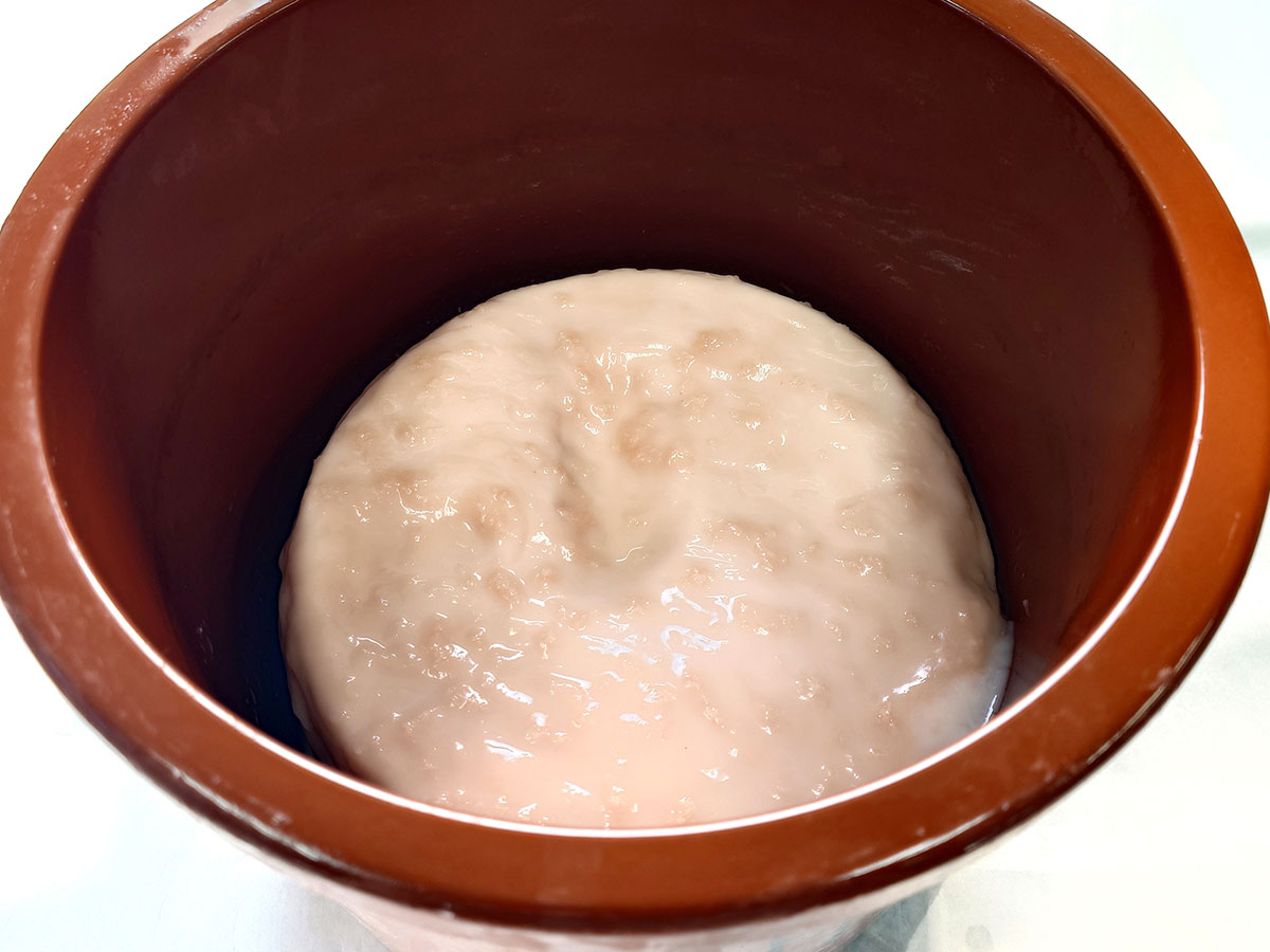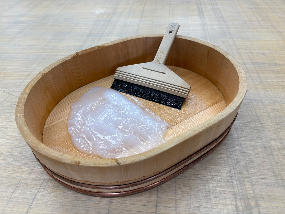 新糊を甕(かめ)に入れ水を張り、冷暗所で数年〜10年ほど寝かせて熟成させた糊で、接着力が弱く、柔軟でしなやかな仕上がりが得られます。掛軸や巻物の中裏打ち・総裏打ちなど、後の修復で剥がしやすさが求められる工程に最適で、軸装の質を左右する重要な材料です。