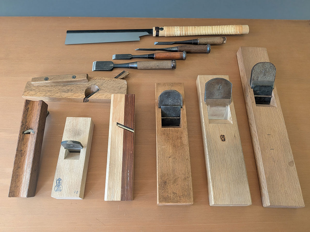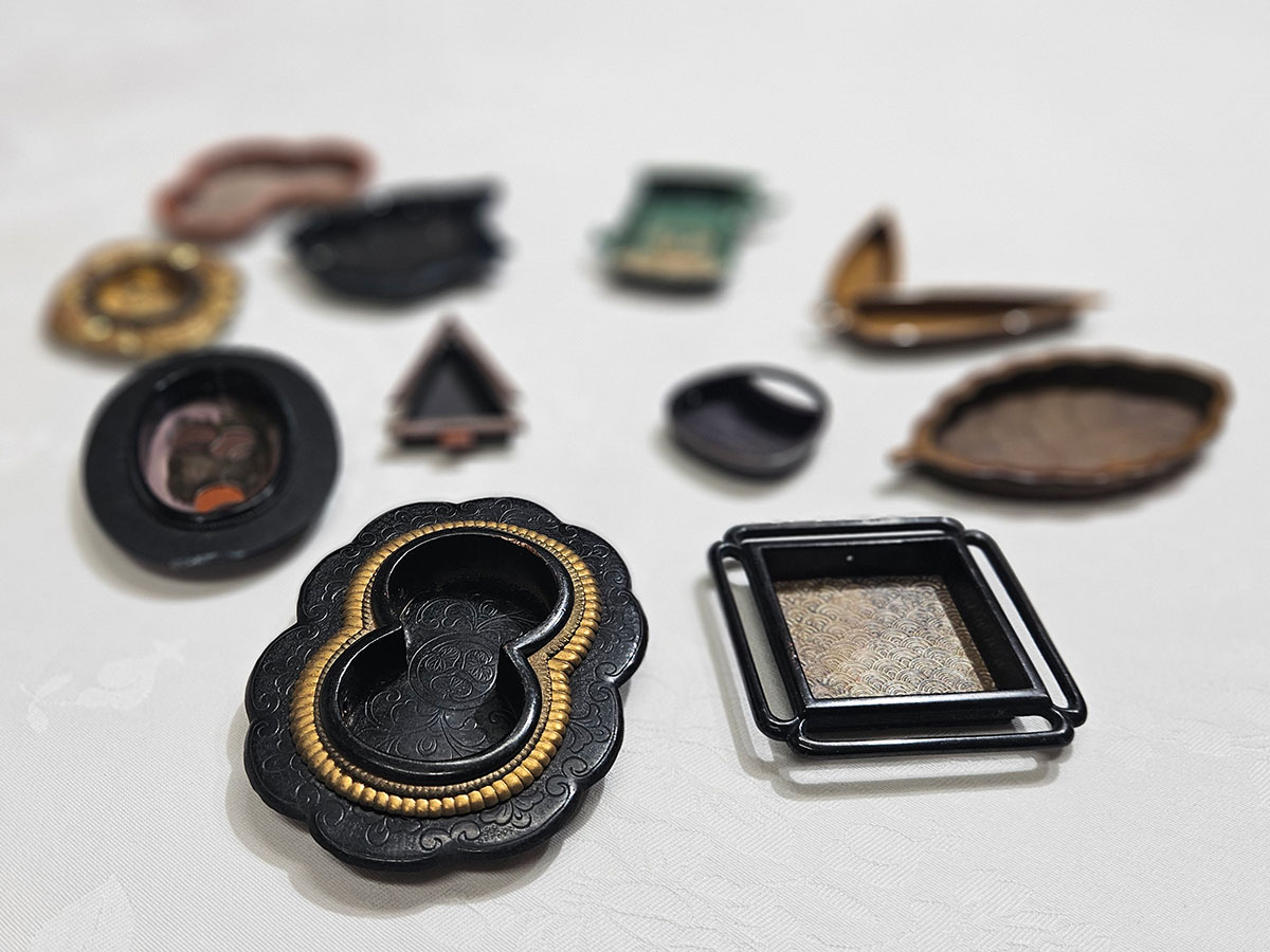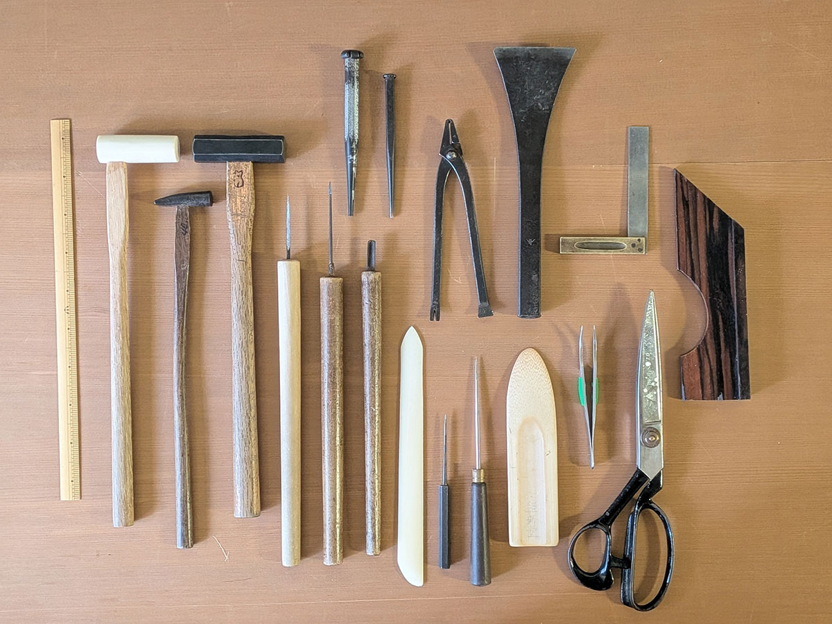 江戸表具の製作には、裂地・紙・糊・木材・金物・陶磁器など多様な材料が用いられます。また、用途や工程に応じて数多くの道具が使い分けられています。