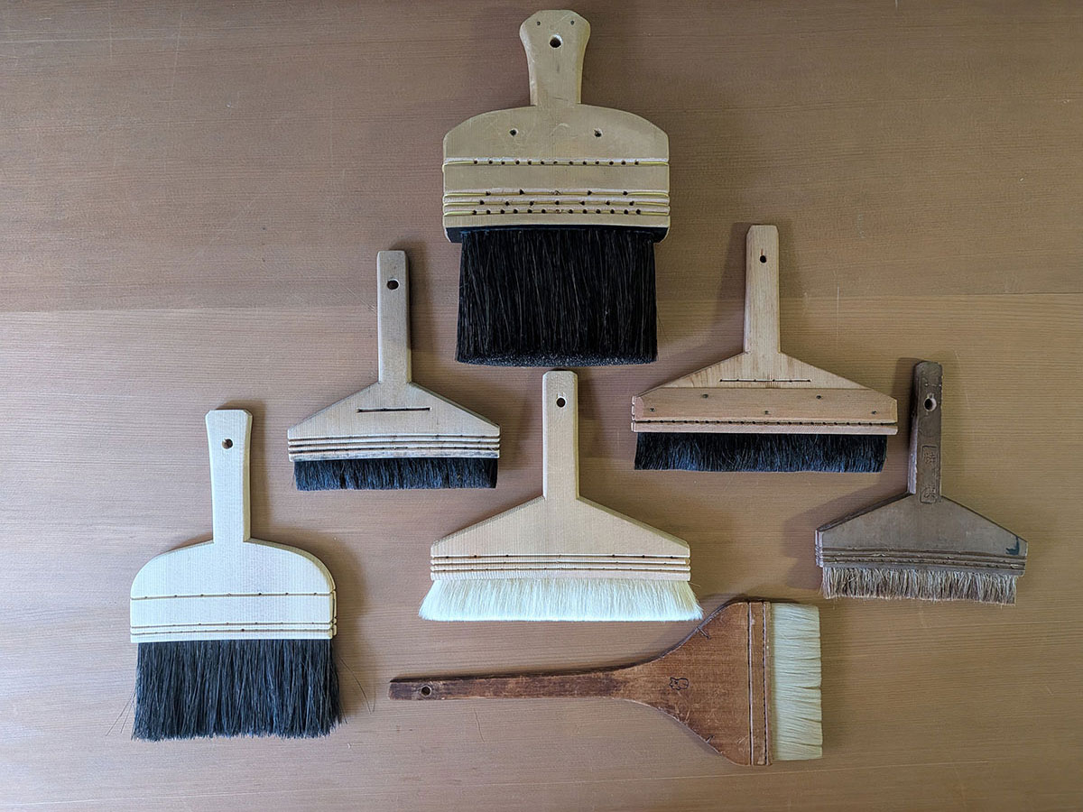 糊を均一に塗布する「糊刷毛(のりばけ)」、作品を伸ばして裏打ち紙を撫でつける「撫刷毛(なでばけ/なぜばけ)」、叩いて紙同士を密着させる「打刷毛(うちばけ)」などがあります。ほかにも水刷毛・切継ぎ刷毛・しごき刷毛など多様な種類があり、毛材は馬・山羊・鹿・狸・豚の獣毛のほか、棕櫚(しゅろ)や津久(つぐ)などの植物繊維も用いられます。用途に応じて硬さやコシを選びます。