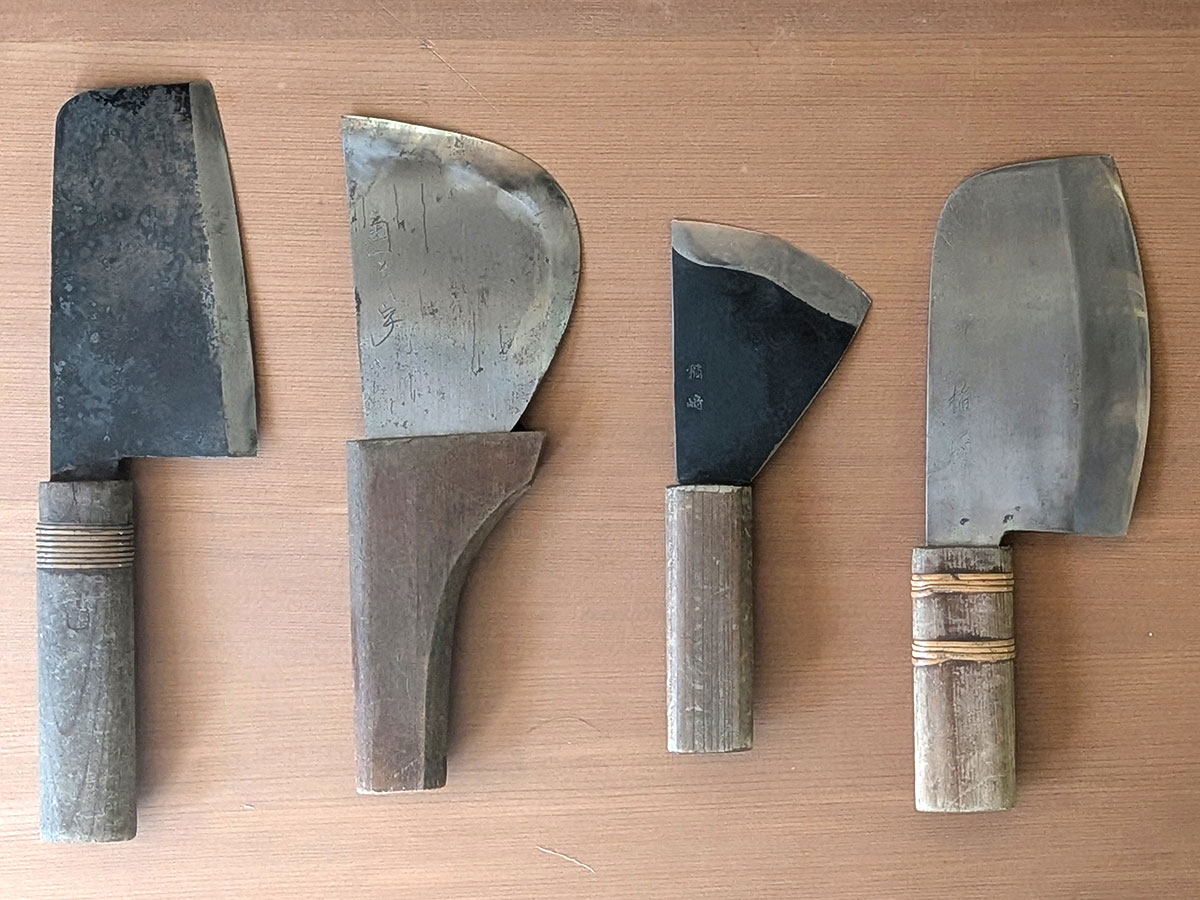 紙や裂地(きれじ)の裁断、木材の加工など、表具作業ではさまざまな包丁や小刀を用います。寸分の狂いなく仕上げるためには、刃の研ぎや扱いも重要な技術の一つです。中でも丸くカーブした刃を持つ「丸包丁」は、裏打ちを施した裂地を滑らかに正確に裁断するうえで欠かせない代表的な刃物です。